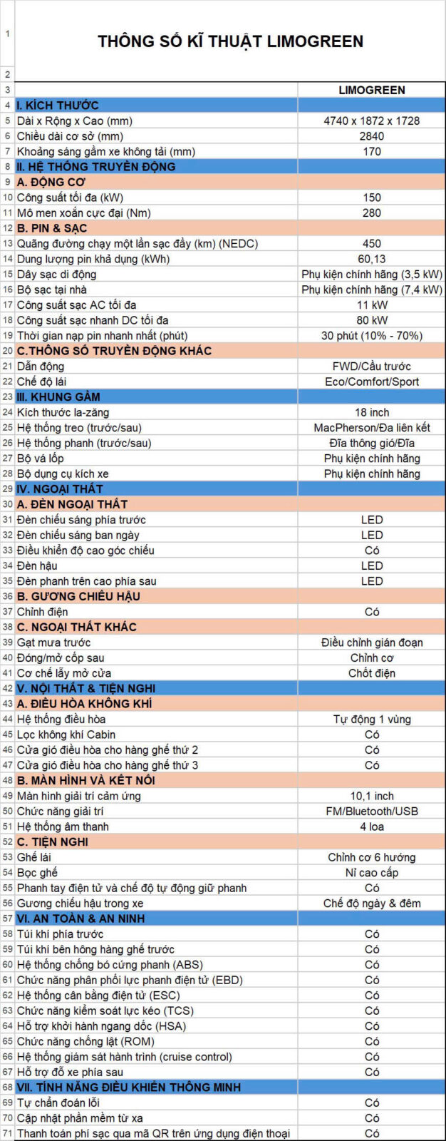 Limo Green được trang bị động cơ điện 150kW (201 mã lực) mang trên mình khối pin LFP 60,13 (kWh), cho khả năng di chuyển lên tới 450 km sau mỗi lần sạc đầy. Hỗ trợ Công suất sạc AC tối đa 11kW và Công suất sạc nhanh DC tối đa 80kW. Thời gian sạc từ 10% lên 70% của xe là 30 phút, giúp tối ưu hiệu suất sử dụng của xe, phù hợp cho những chuyến đi dài.