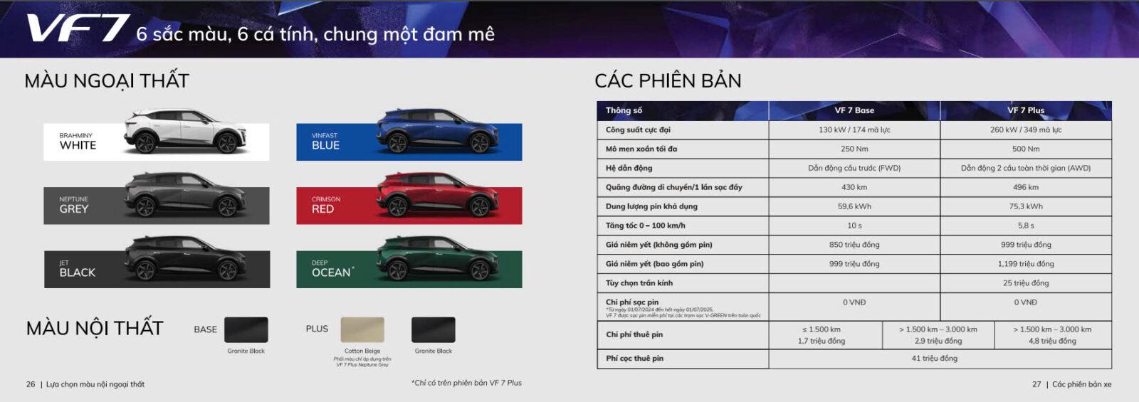 Trong khi đó, VF 7 phiên bản Base được trang bị một động cơ điện có công suất tối đa 130 kW (tương đương 174 mã lực), mô-men xoắn cực đại 250 Nm cùng bộ pin dung lượng 59,6 kWh, có khả năng di chuyển quãng đường tối đa 375 km/lần sạc đầy (theo tiêu chuẩn WLTP). Nếu như phiên bản Plus sẽ đáp ứng tối đa đam mê tốc độ và nhu cầu di chuyển trên những chặng đường dài, thì phiên bản Base sẽ là lựa chọn đầy phong cách và linh hoạt trên những cung đường đô thị.